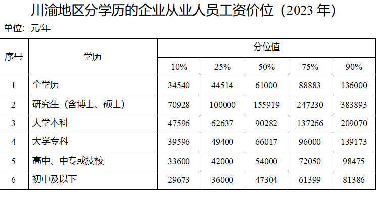 根据调查数据,从整体工资报酬来看,川渝地区2023年企业从业人员工资报酬中位数为61000元/年,与上一年(59000元/年)相比增长3.4%。从行业工资价位来看,中位数排名前三的行业分别是金融业,电力、热力、燃气及水生产和供应业,信息传输、软件和信息技术服务业,分别为131604元/年,90470元/年,86046元/年。