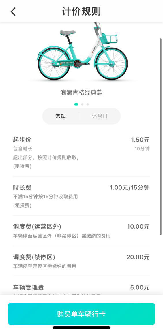 滴滴青桔单车、哈啰单车现在的收费标准(常规)为起步价(前10分钟)1.5元,后续每15分钟1元;休息日的收费标准为起步价(前10分钟)1.8元,后续每15分钟1元。