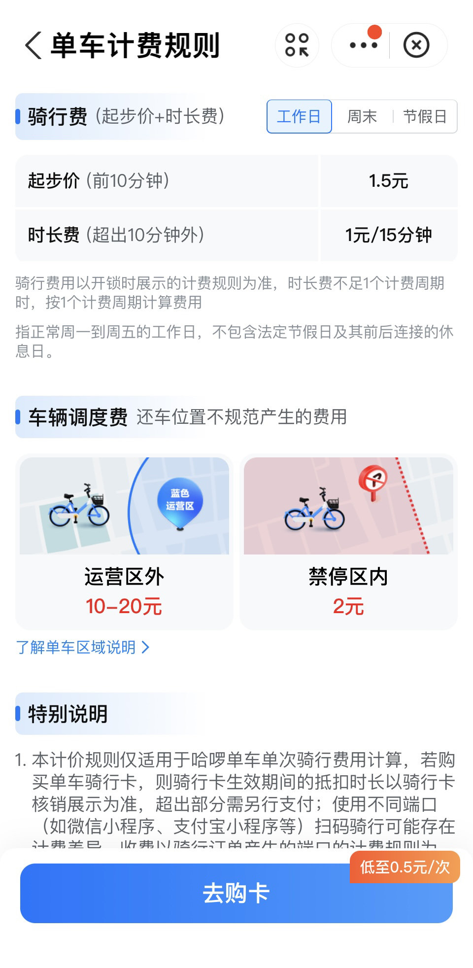 对比往期计价规则,本次调整主要是将起步价的使用时间从15分钟缩短为10分钟。这意味着,调整后,工作日骑行半小时的费用从2.5元上涨到了3.5元,上涨了40%;周末和节假日骑行半小时的费用从2.8元上涨至3.8元,上涨了35%。