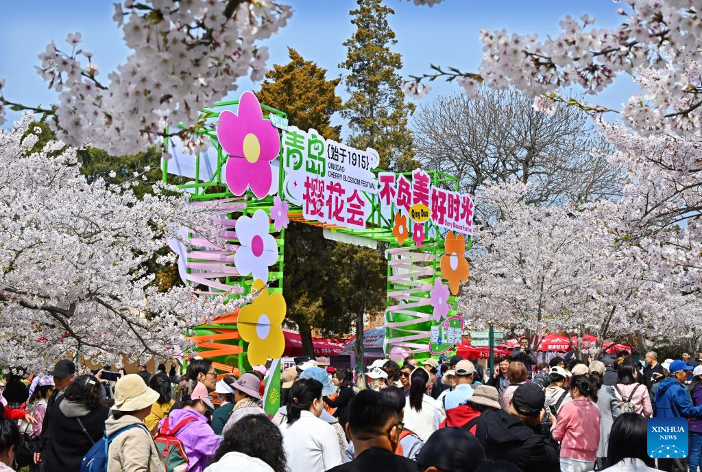 People view cherry blossoms at Zhongshan Park in Qingdao, east China's Shandong Province, April 11, 2024. (Xinhua/Li Ziheng)
