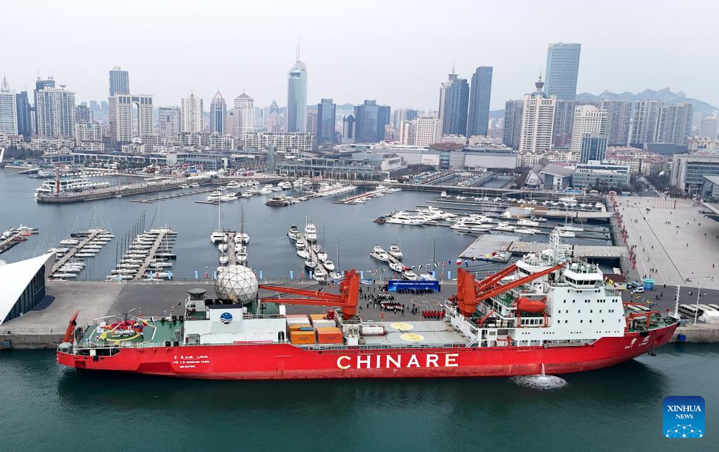 An aerial drone photo shows China's icebreaker Xuelong berthing at a pier in Qingdao, east China's Shandong Province, April 10, 2024. (Xinhua/Li Ziheng)