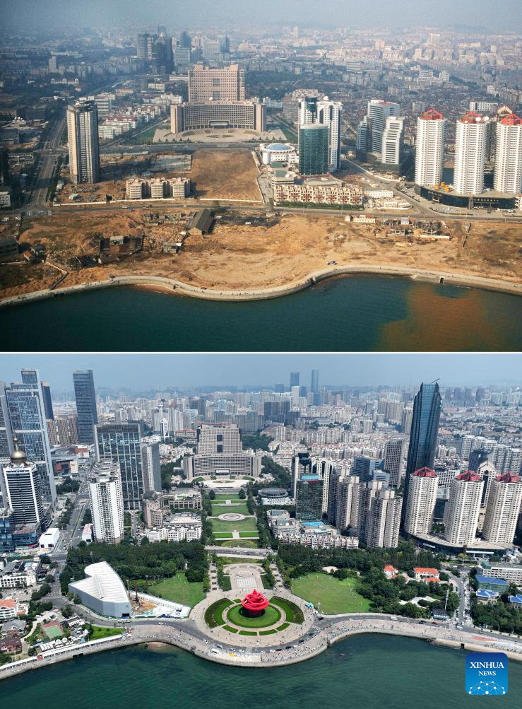 This combo photo shows the Wusi Square under construction in 1996 (above, provided by the Qingdao publicity department) and an aerial view of Wusi Square on Aug. 17, 2024 (below, shot by Xinhua photographer Li Ziheng) in Qingdao, east China's Shandong Province. (Xinhua)