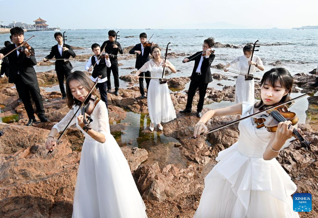 Students from the Ocean University of China perform at the Zhanqiao Pier scenic spot in Qingdao, east China's Shandong Province, April 18, 2024. (Xinhua/Li Ziheng)