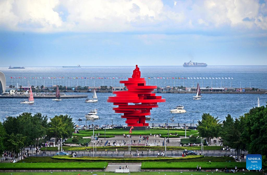 This photo shows a view of the Wusi Square against the background of Qingdao Olympic Sailing Center in Qingdao, east China's Shandong Province, Aug. 19, 2024. (Xinhua/Li Ziheng)