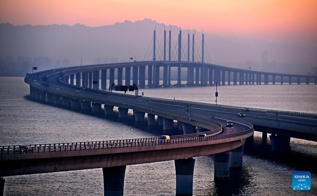 Vehicles run on the Jiaozhou Bay bridge in Qingdao, east China's Shandong Province, Jan. 1, 2024. (Xinhua/Li Ziheng)