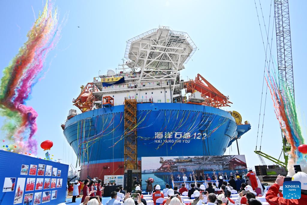 A delivery ceremony of Haikui No. 1, Asia's first cylindrical floating, production, storage, and offloading (FPSO) facility, is held in Qingdao, east China's Shandong Province, April 26, 2024. (Xinhua/Li Ziheng)