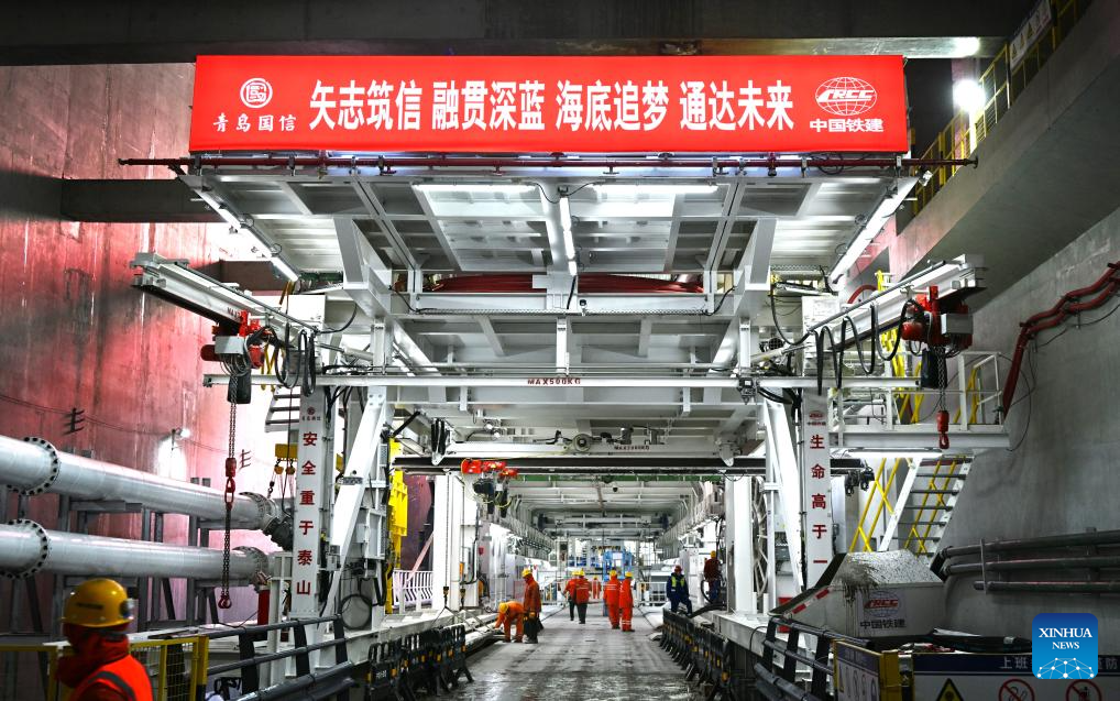 Staff members work at the construction site of an undersea tunnel in Qingdao, east China's Shandong Province, Jan. 23, 2024. (Xinhua/Li Ziheng)