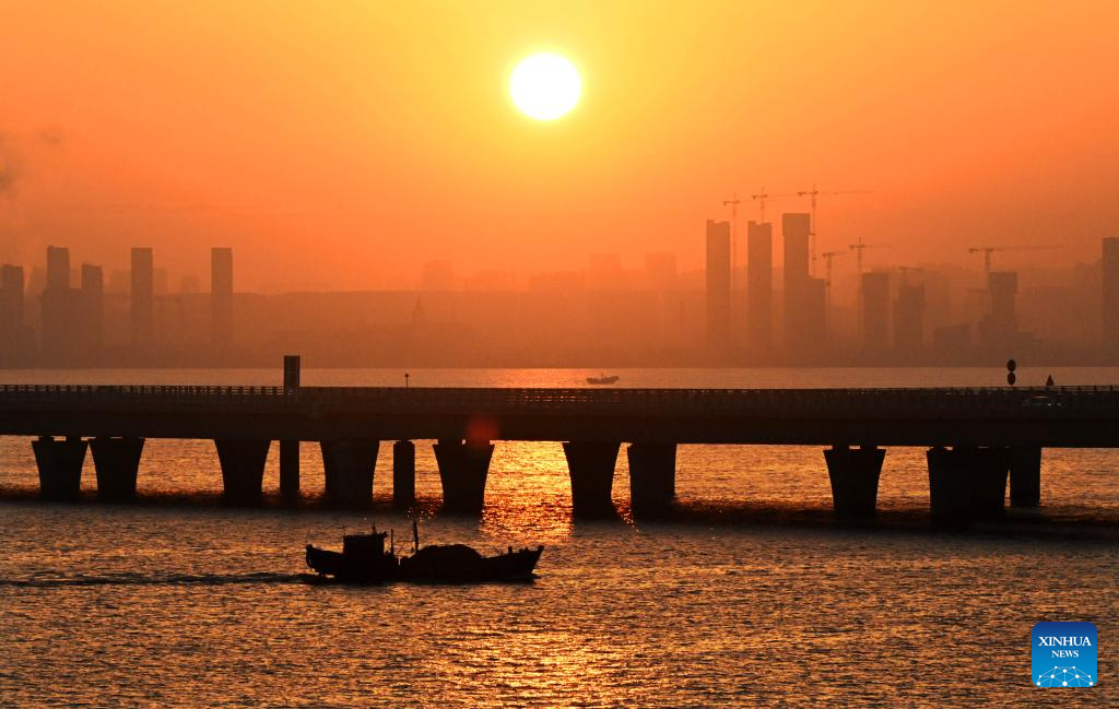 A fishing boat moves near the Jiaozhou Bay bridge at sunrise in Qingdao, east China's Shandong Province, Jan. 1, 2024. (Xinhua/Li Ziheng)