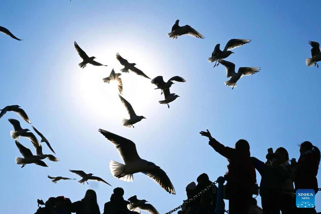 Tourists watch seagulls at Zhanqiao Pier scenic spot in Qingdao, east China's Shandong Province, Jan. 24, 2024. (Xinhua/Li Ziheng)