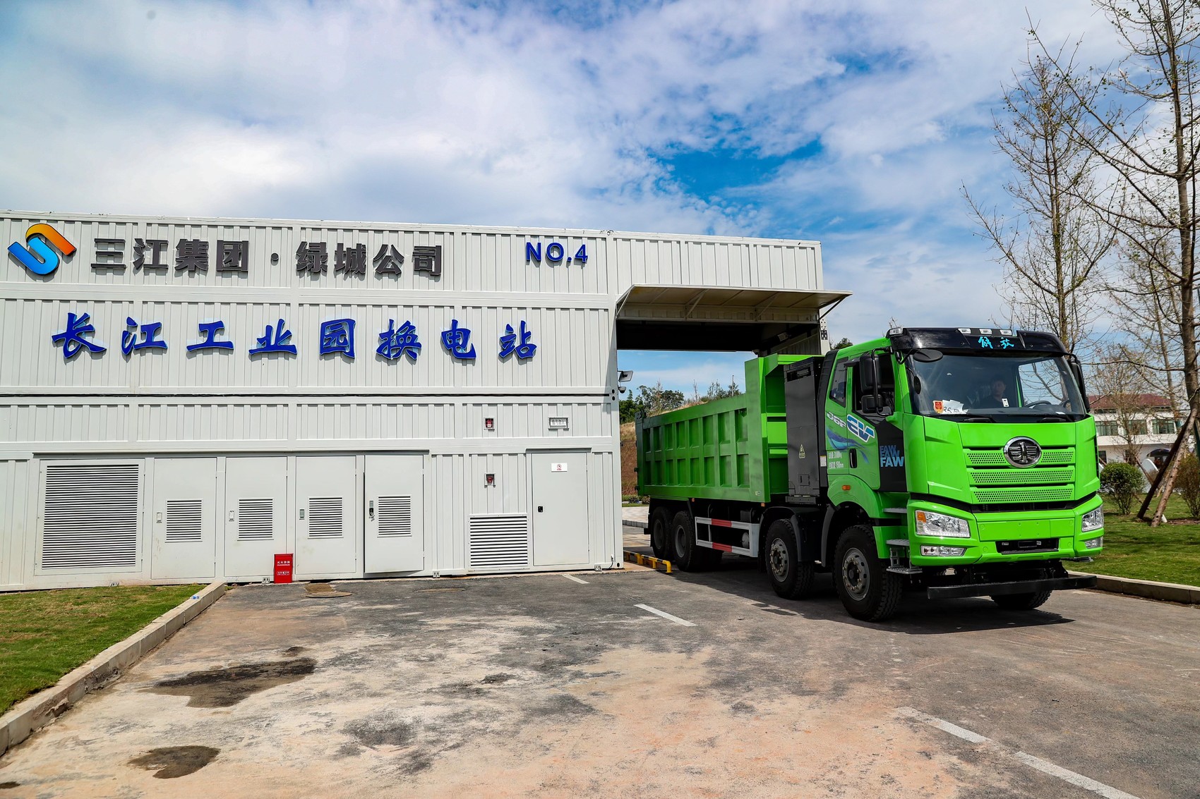 在四川省宜宾三江新区长江工业园换电站,几辆重型卡车正在站内进行重卡换电。庄歌尔 摄