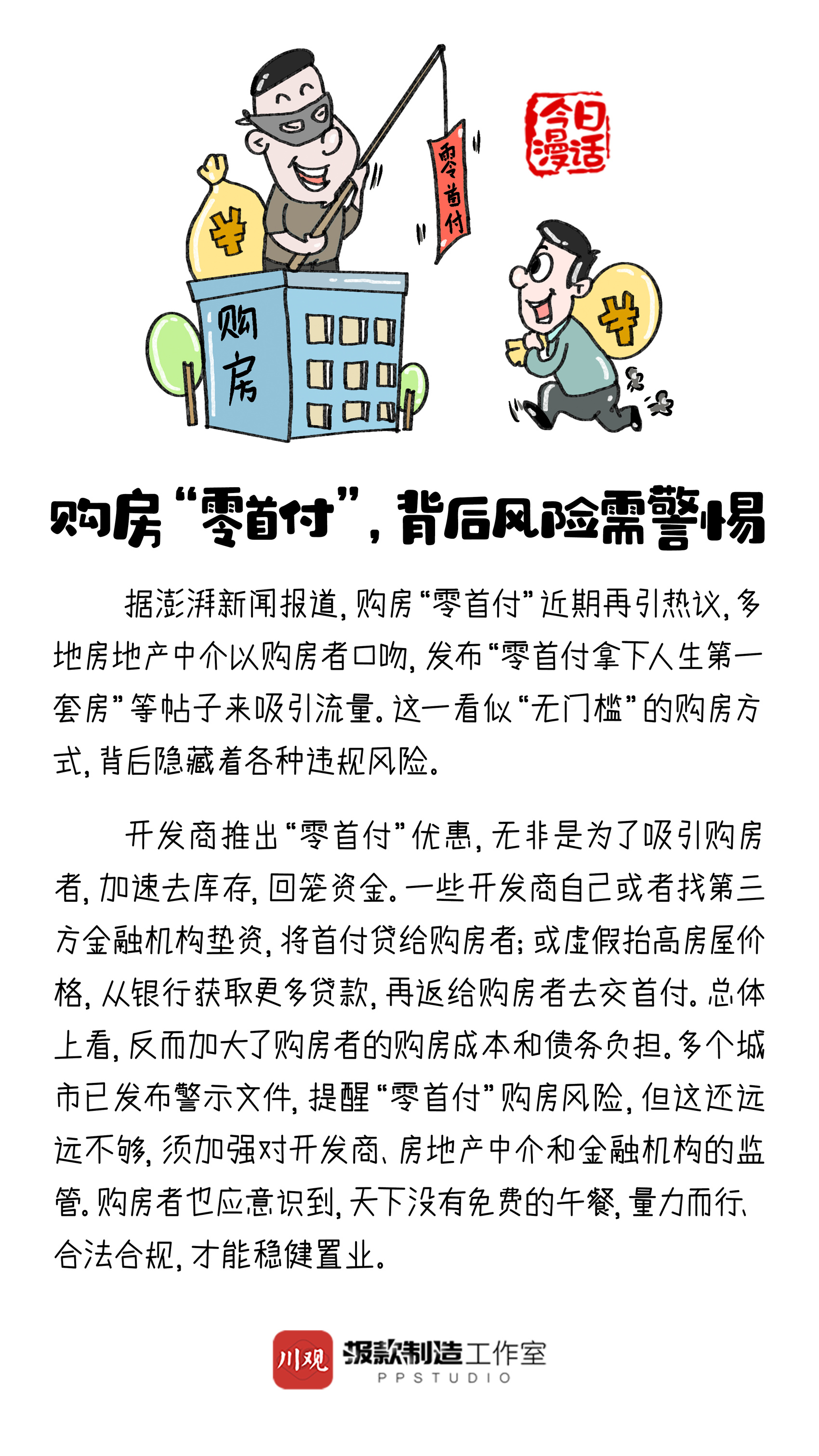 据澎湃新闻报道,购房“零首付”近期再引热议,多地房地产中介以购房者口吻,发布“零首付拿下人生第一套房”等帖子来吸引流量。这一看似“无门槛”的购房方式,背后隐藏着各种违规风险。对此,你怎么看?