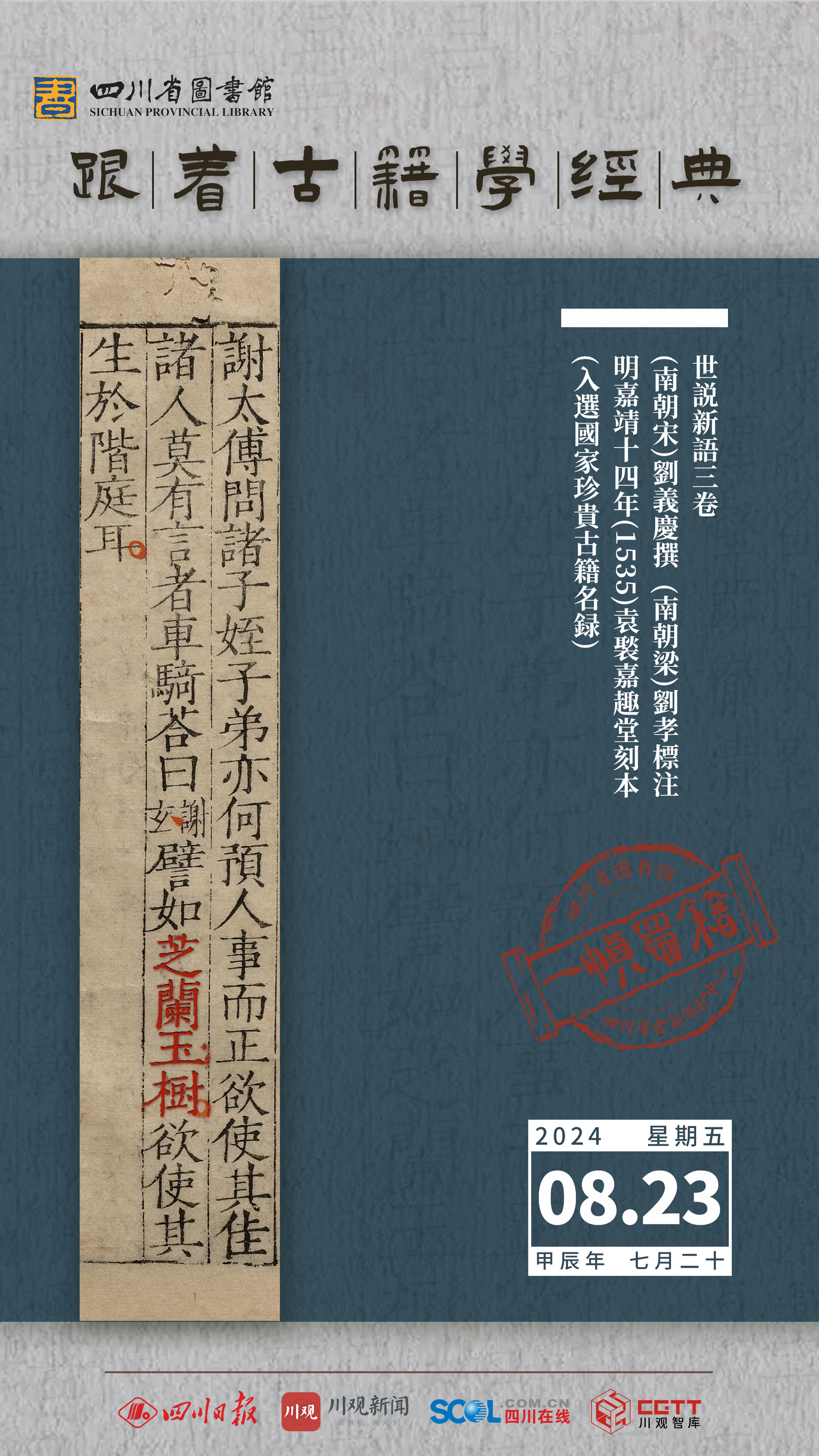 8月23日,一帧蜀籍带你了解“芝兰玉树”的典故。海报所选用图源于世说新语三卷(南朝宋)刘义庆撰(南朝梁)刘孝标注 明嘉靖十四年(1535)袁裴嘉趣堂刻本。