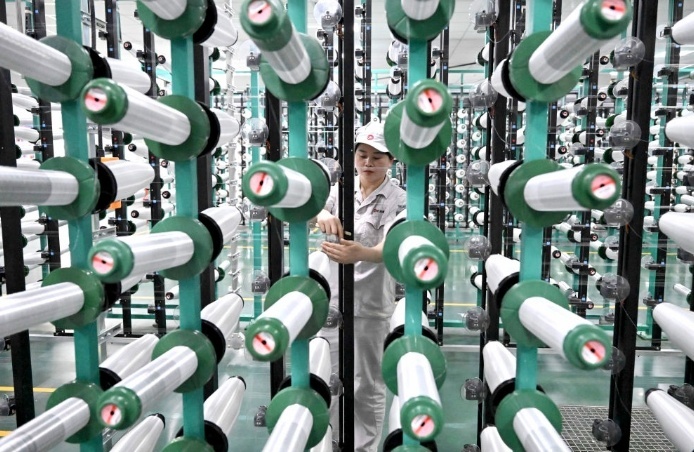 在位于河南安阳林州市的河南光远新材料股份有限公司电子布准备车间,工作人员在检查整经机机台(2024年2月22日摄)。该公司通过自主技术创新,攻克“卡脖子”技术,研发出5G用低介电电子纱、5G用超薄电子布等产品。新华社记者 李安摄