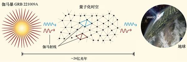 量子化时空破坏洛伦兹不变性,导致不同能量光子的真空传播速度有微弱差异。图片来源于紫金山天文台