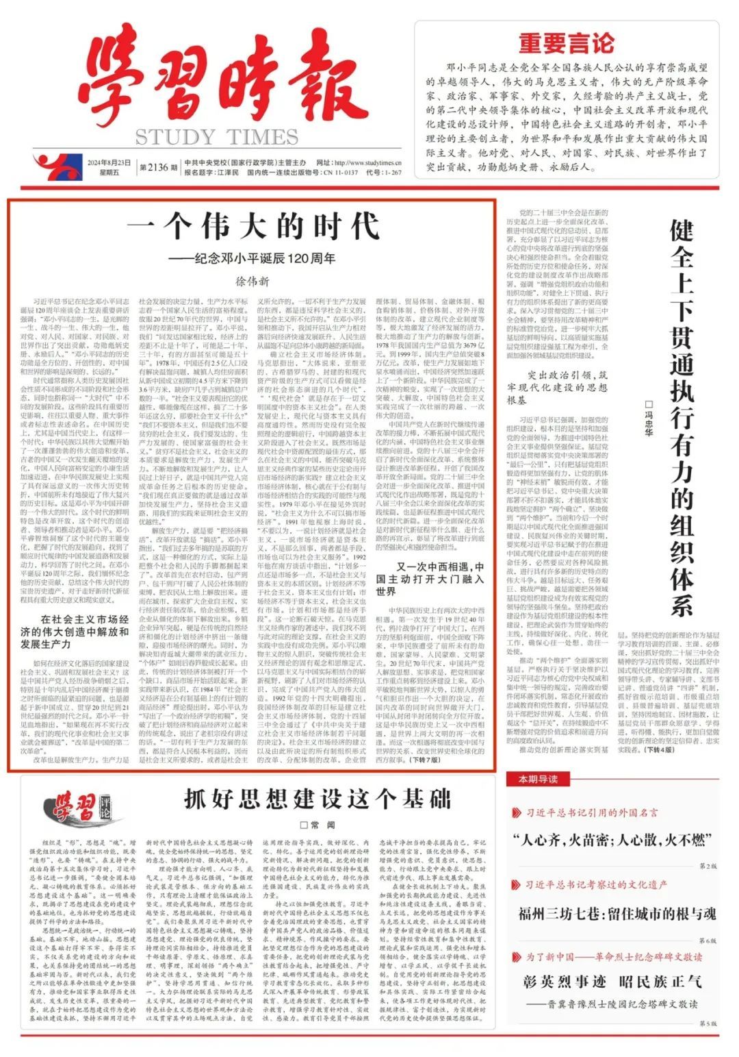 时代通常指称人类历史发展因社会性质不同形成的不同阶段和社会形态,同时也指称同一“大时代”中不同的发展阶段。这些阶段具有重要历史影响,往往以重要人物、重大事件或者标志性表述命名。在中国历史上,尤其是中国当代史上,有这样一个时代:中华民族以其伟大觉醒开始了一次蓬蓬勃勃的伟大创造和变革,古老的中国又一次发生翻天覆地的变化,中国人民向富裕安定的小康生活加速迈进,在中华民族发展史上实现了具有深远意义的一次伟大历史转折,中国前所未有地接近了伟大复兴的历史目标。这是邓小平为中国开辟的一个伟大的时代。这个时代的鲜明特色是改革开放,这个时代的创造者、领导者和推动者是邓小平。邓小平睿智地洞察了这个时代的主题变化,把握了时代的发展趋向,找到了顺应时代规律的中国发展道路和发展动力,科学回答了时代之问。在邓小平诞辰120周年之际,我们缅怀纪念他的历史贡献,总结这个伟大时代的宝贵历史遗产,对于走好新时代新征程具有重大历史意义和现实意义。