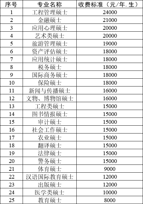 (2)硕士专业学位研究生学费标准按不超过省内全日制专业学位研究生收费标准高限(见下表)的原则,由各研究生培养单位自主确定。新增的专业学位类别参照省内已有同类或相近的专业学费标准执行。