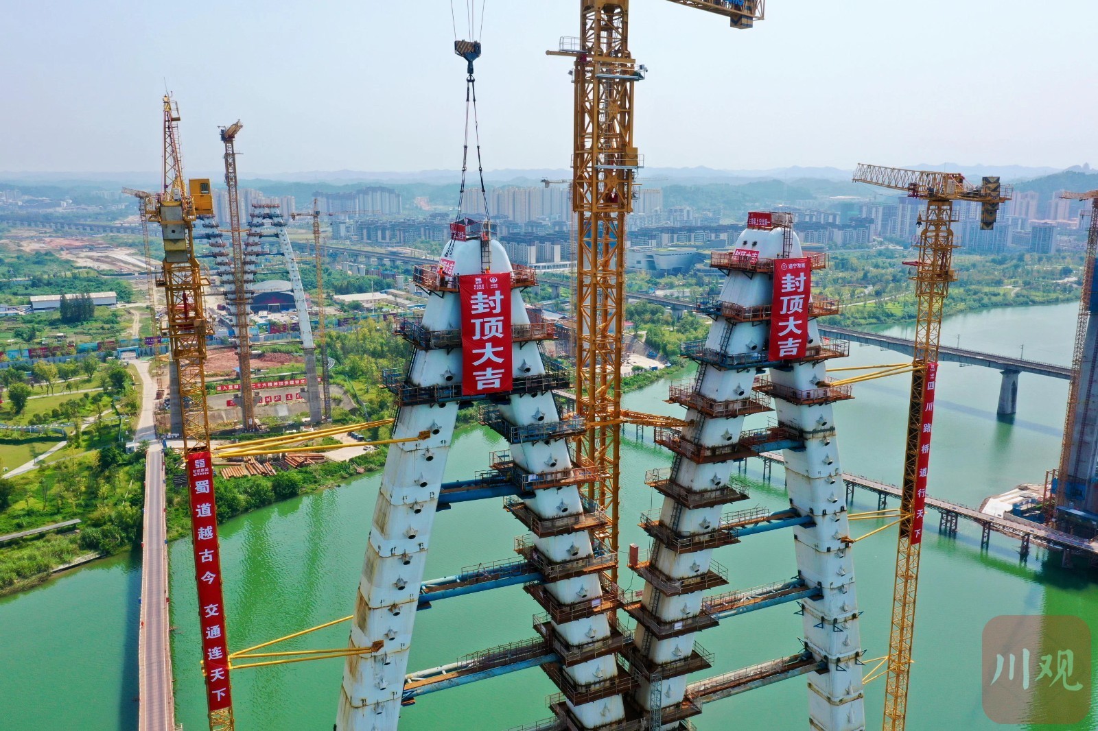 8月22日上午,经过近2年建设的遂宁涪江六桥实现主塔封顶。