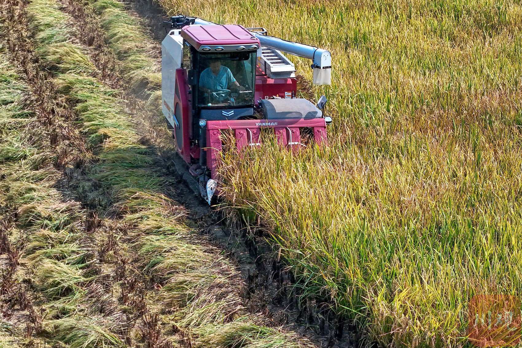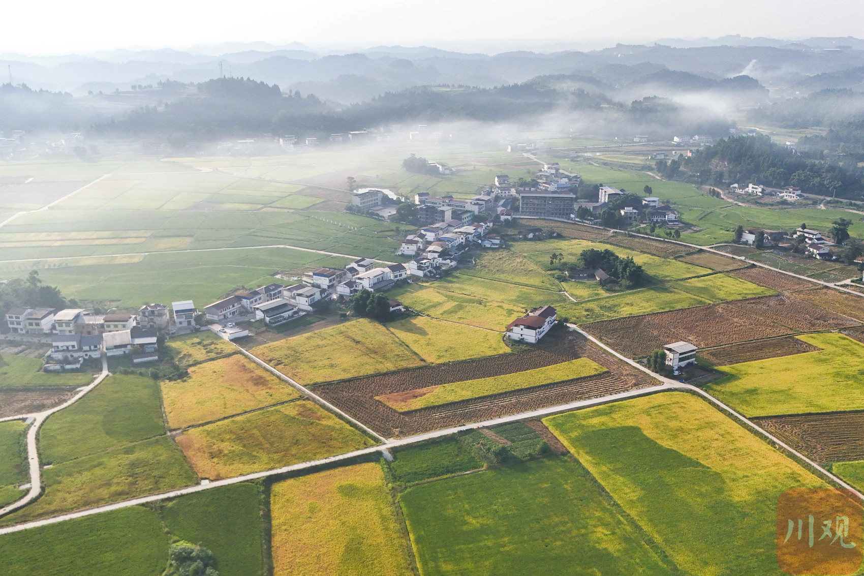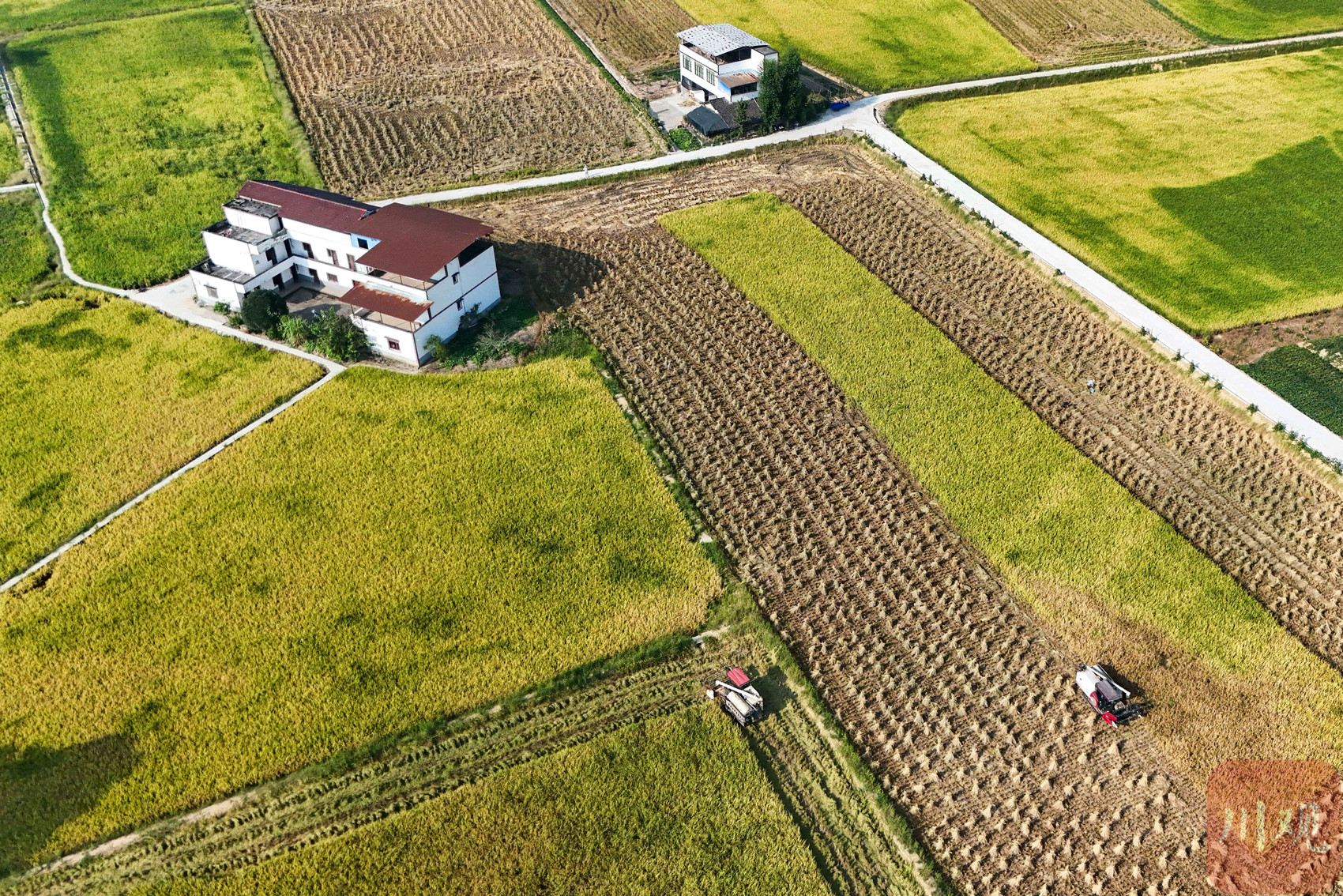 俯瞰田野,大面积稻谷变成金黄色,一派丰收景象。