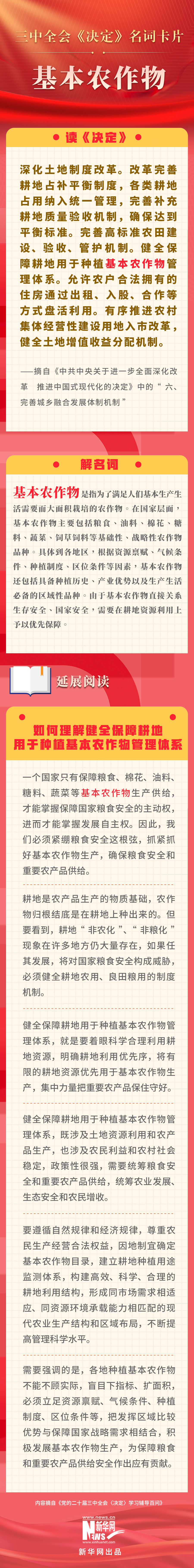 党的二十届三中全会审议通过了《中共中央关于进一步全面深化改革、推进中国式现代化的决定》。新华网依据《党的二十届三中全会〈决定〉学习辅导百问》,制作三中全会《决定》系列名词卡片,和大家一起来深入学习领会二十届三中全会精神。本期名词是“基本农作物”。