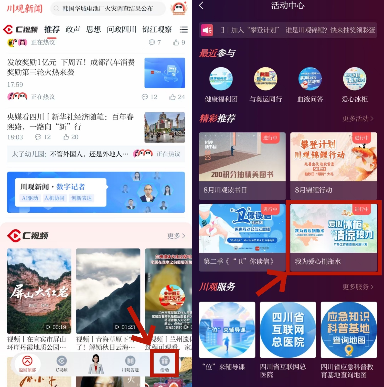 第二步:在川观新闻首页,点击“活动”,找到 “我为爱心捐瓶水”活动图片,点击即可参与。