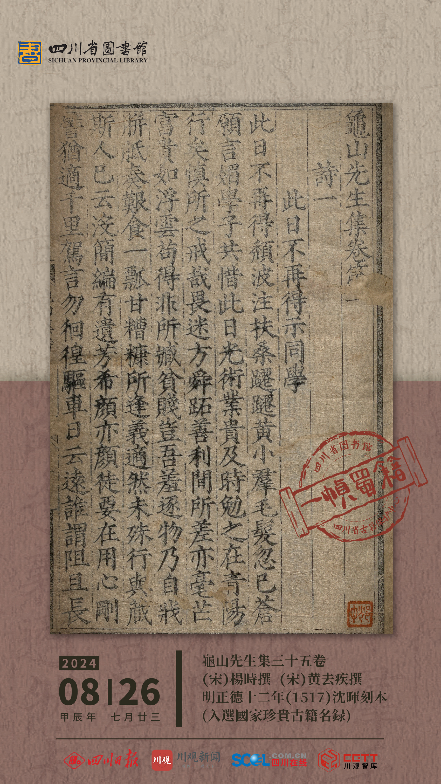 8月26日,一帧蜀籍带你走进“闽学鼻祖”杨时。海报所选用图为《龟山先生集》三十五卷(宋)杨时撰(宋)黄去疾撰 明正德十二年(1517)沈晖刻本(入选国家珍貴古籍名录)。