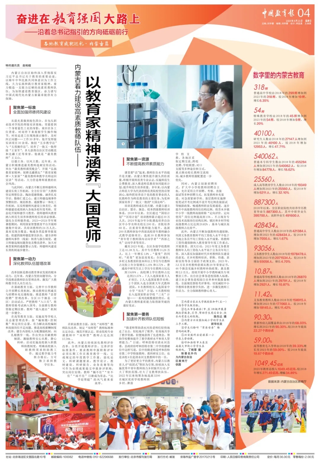 到2035年建成教育强国,是党中央作出的重要决策部署,是习近平总书记念兹在兹、殷切期盼的“国之大者”。教育系统牢记嘱托,砥砺奋进,奋力书写教育强国建设支撑引领中国式现代化的新篇章。日前,教育部新媒体矩阵推出“奋进在教育强国大路上——沿着总书记指引的方向砥砺前行”专栏,展示教育系统加快建设教育强国的生动实践。今天,“奋进在教育强国大路上——沿着总书记指引的方向砥砺前行”专栏之“各地教育成就巡礼”系列,通过一个视频、一组大图、一篇报道介绍内蒙古如何着力建设高素质教师队伍——