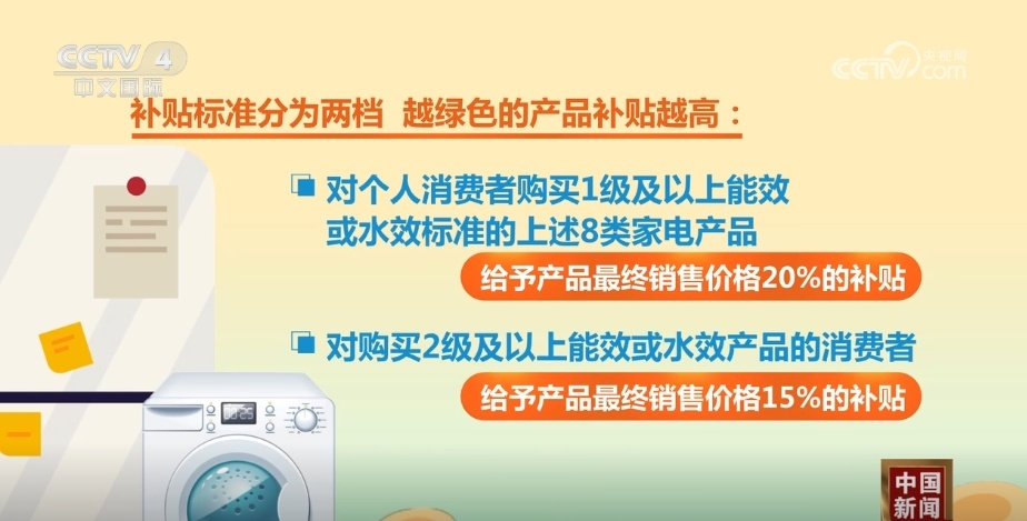 国家直接向地方安排超长期特别国债资金,支持家电以旧换新,补贴资金按照总体9比1的原则实行央地共担。而补贴标准分为两档,越绿色的产品补贴越高:对个人消费者购买1级及以上能效或水效标准的上述8类家电产品,给予产品最终销售价格20%的补贴;对购买2级及以上能效或水效产品的消费者,给予产品最终销售价格15%的补贴。每位消费者每类产品都可以补贴1件,最高补贴金额为2000元。