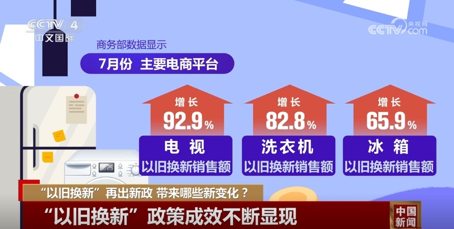 从今年3月国家出台家电以旧换新政策以来,各地都推出了优惠活动吸引消费者。商务部数据显示,7月份,主要电商平台电视机、洗衣机、冰箱以旧换新销售额分别增长92.9%、82.8%和65.9%。今年1—7月,限额以上单位家用电器和音像器材类商品零售额5221亿元,同比增长2.3%。其中,绿色、智能产品供给持续优化,高能效等级家电、智能家电零售额增速明显快于家用电器和音像器材类的平均水平。