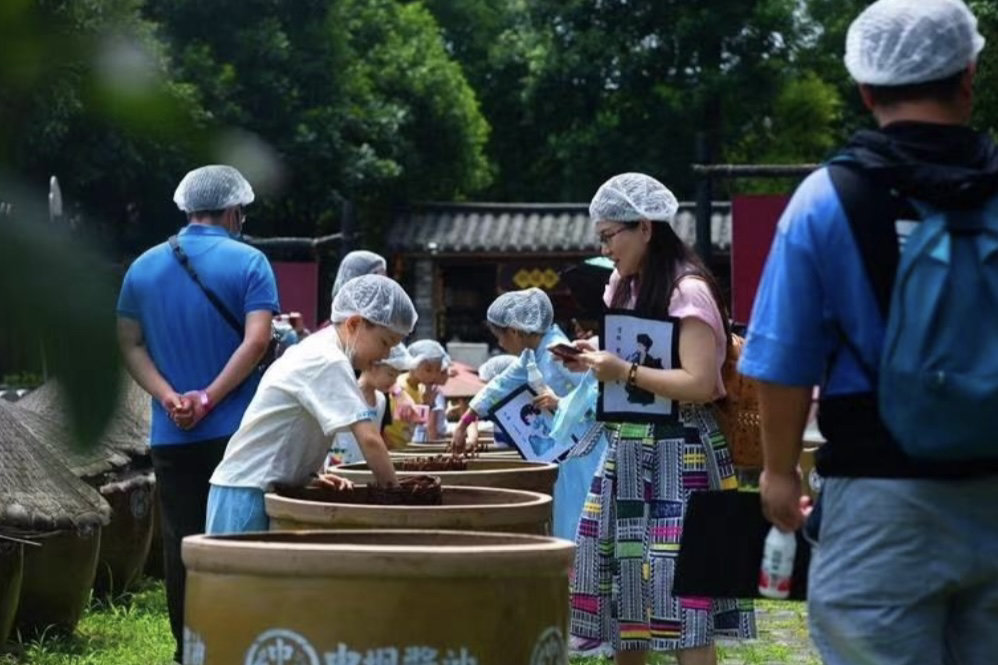 成都川菜博物馆里,学生们动手体验郫县豆瓣传统制作工艺。