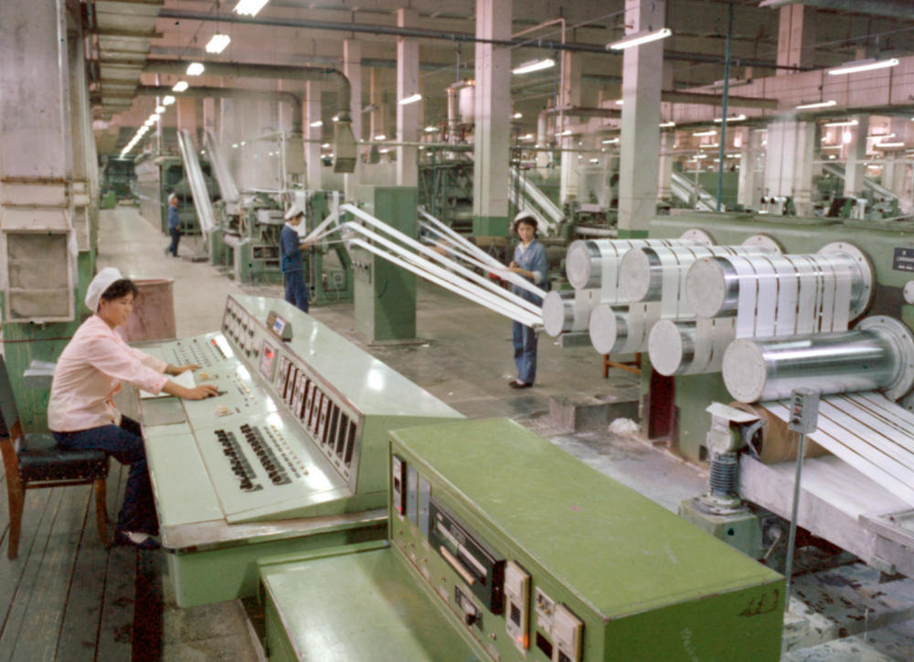 1981年,东北辽阳石油化学纤维厂抽丝车间一角。新华社发
