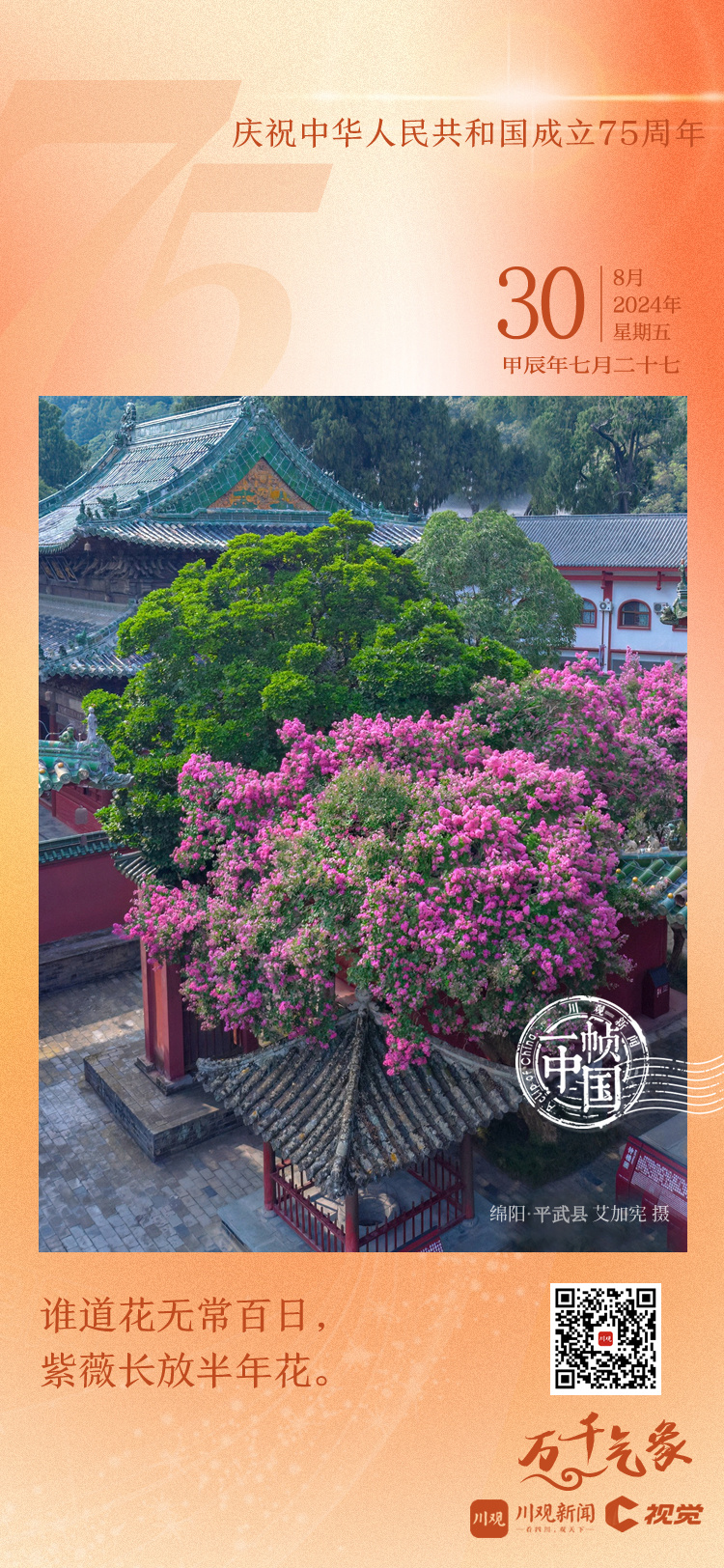 今天距离2024年国庆节还有32天,川观新闻《一帧中国》带你来到绵阳市平武县报恩寺,欣赏花开正盛的紫薇花。