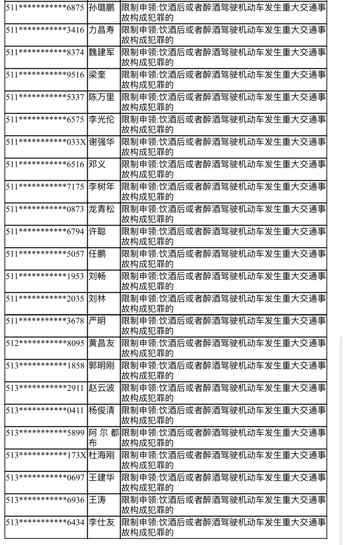 其中,35人因饮酒后或醉酒驾驶机动车发生重大交通事故构成犯罪,被公安交管部门吊销驾驶证且终生禁驾。23人因造成重大交通事故构成犯罪且逃逸,被公安交管部门吊销驾驶证且终生禁驾。