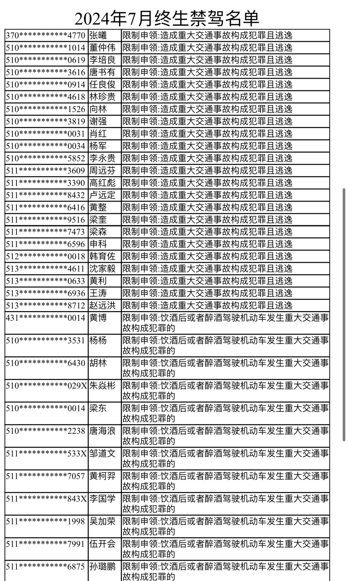 8月27日,四川省公安厅交警总队公布了2024年7月被终生禁驾的58人名单,其中年龄最大的71岁,年龄最小的17岁。