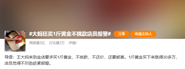 近日,话题#大妈狂买1斤黄金不挑款店员报警#登上热搜。这到底是怎么回事呢?