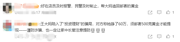 据都市报道消息,8月27日,河南新密的王大妈来到金店要求买1斤黄金,不挑款,不还价,还要邮寄。1斤黄金买下来就得30多万,店员觉得不对劲赶紧报警。民警调查后发现王大妈是陷入了“投资理财”的骗局,对方称她已经挣了60万,必须邮寄500克黄金才能提现。无论民警如何劝阻,王大妈都听不进去,还要投诉民警。无奈之下,民警只好先拦截王大妈寄出的黄金快递,幸好快递还在路上,1斤黄金总算保住了。在民警的劝说之下,王大妈终于幡然醒悟,对民警表示感谢。
