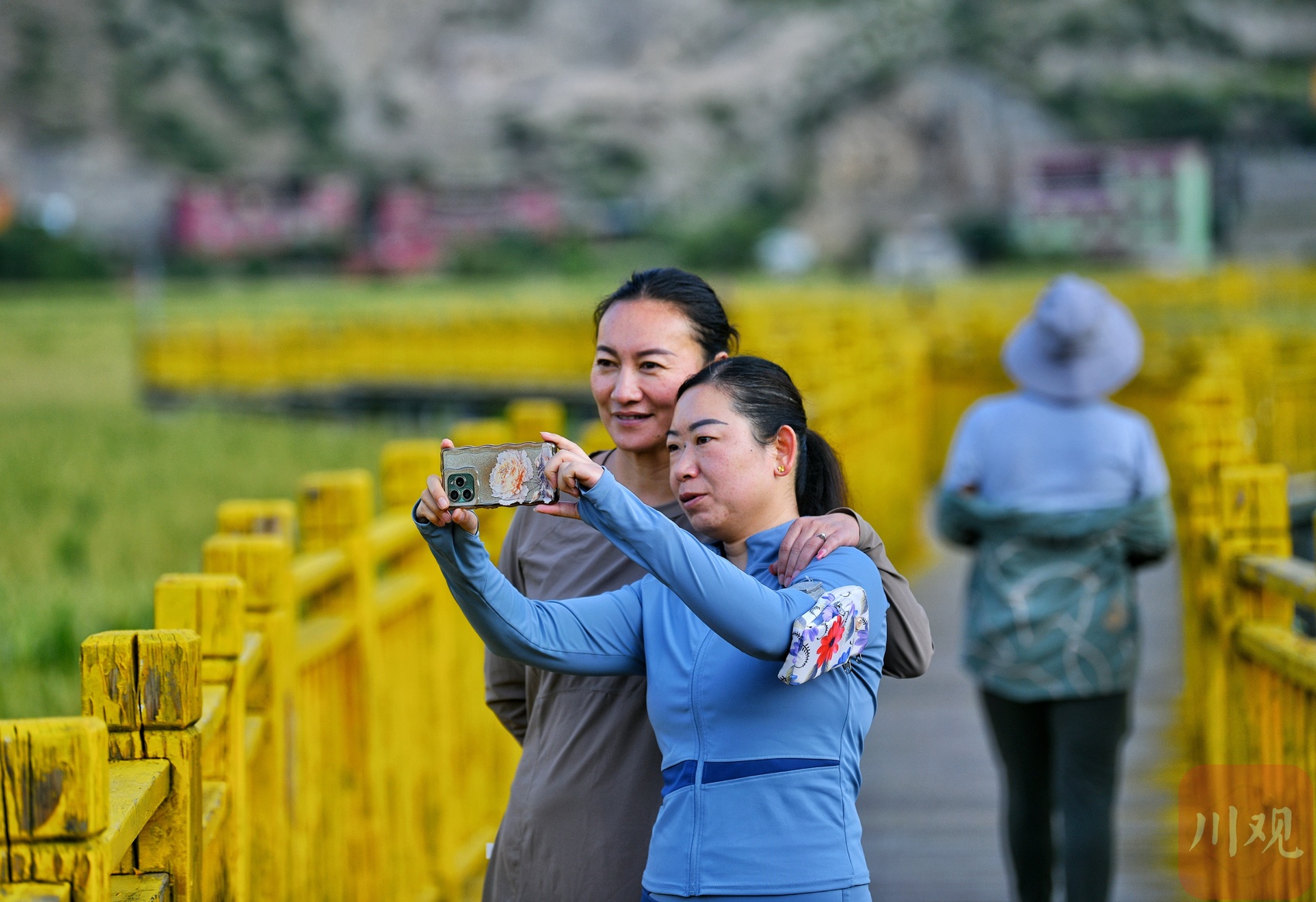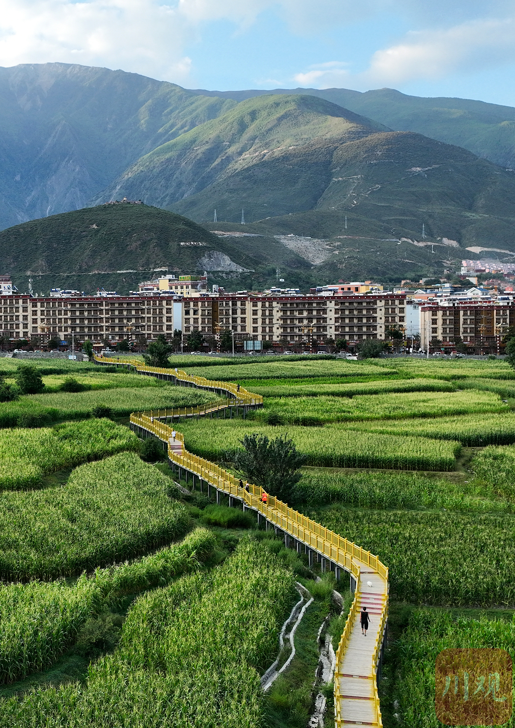据了解,“田园栈道”是巴塘县在农旅结合、观光农业方面作为亮点打造的特色景点,现如今是网红地,不少自驾游的旅行者都会慕名前来田园栈道打卡。吸引的不止是游客,当地居民也喜欢早晚来这里漫步。看到记者在拍照,栈道上晨练的当地人笑着邀请:“这里漂亮吧,每天都有像您这样的人拿着相机来拍照,拍完就走一圈,走栈道一圈只需要2500步。”