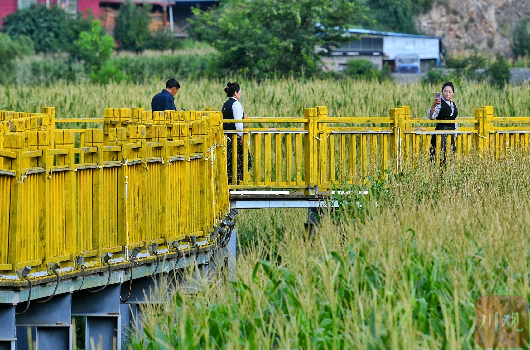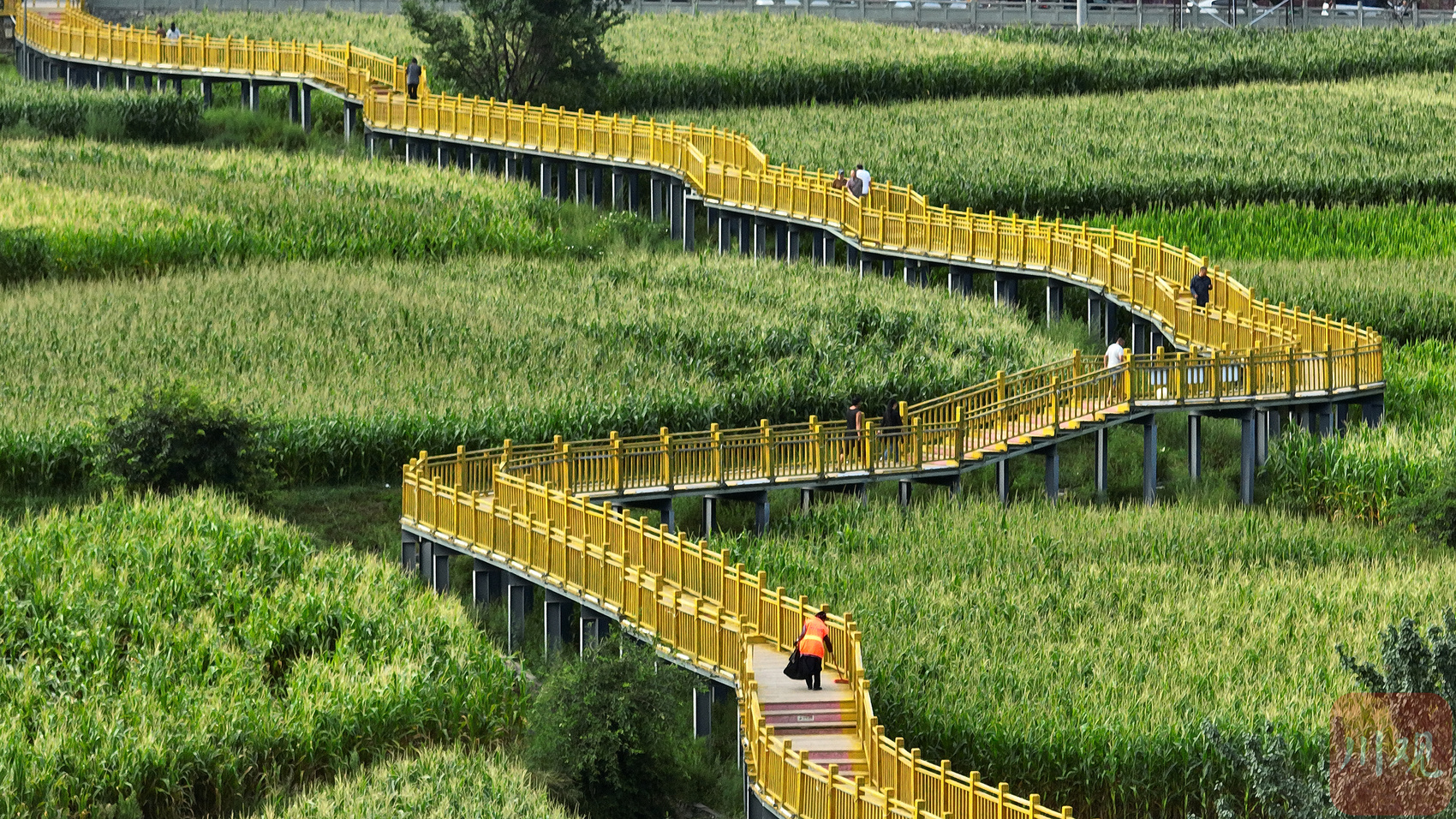 28日晨,记者从住地步行到县城边的“田园栈道”,只用了10分钟。此时晨光中天色已泛蓝,田地里悬空架起的栈道,从郁郁葱葱的玉米田里一直曲折延伸,从空中俯瞰如同黄色哈达缠绕在翠绿田间,此景让人眼前一亮。