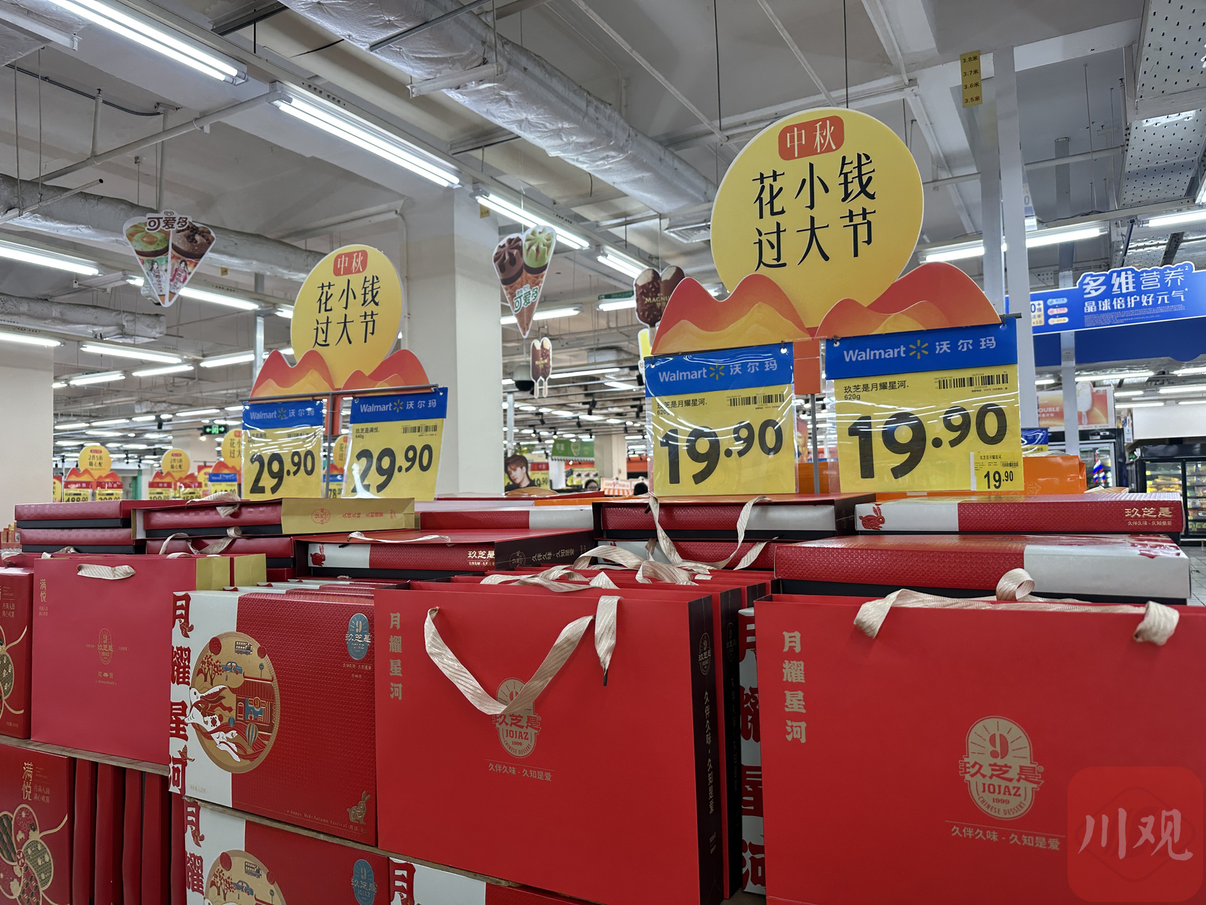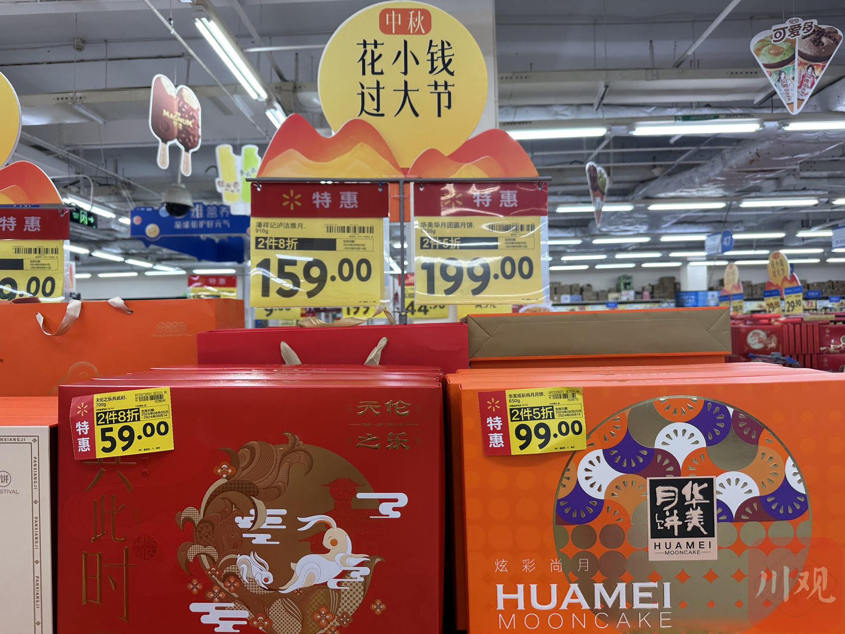“今年月饼的价格相当划算,20、30元礼盒装的月饼有很多种可以选。这段时间卖的比较好的是100多元的礼盒装月饼。”沃尔玛销售人员介绍。从价格来看,该超市内各品牌的普通月饼价位多数在200元以下,少数高端品牌和系列价格在200元—500元之间。此外,各大品牌产品几乎一上架就开始促销,给予不同折扣优惠:两件八折、两件五折等活动随处可见。
