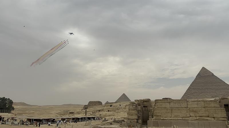 8月28日,在埃及吉萨金字塔景区,中国空军1架运-20与空军八一飞行表演队6架歼-10表演机编队飞越金字塔上空。
