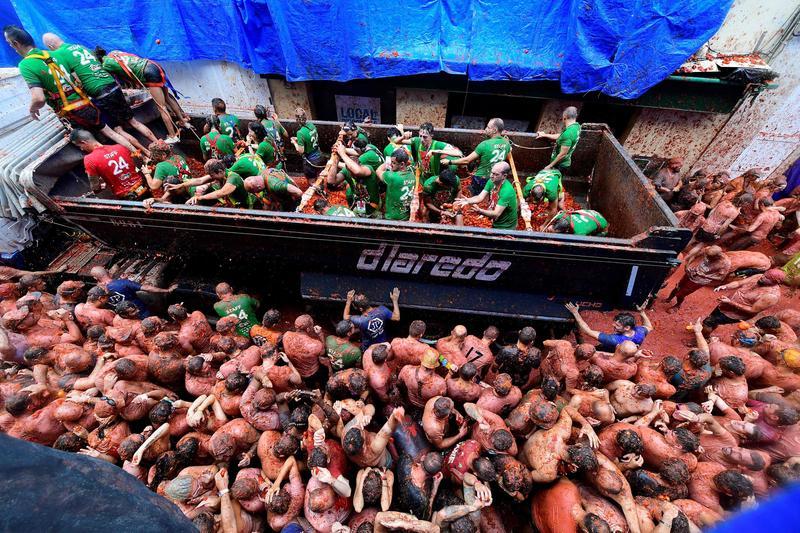8月28日,在西班牙布尼奥尔举行的“西红柿节”上,人们参加“西红柿大战”。