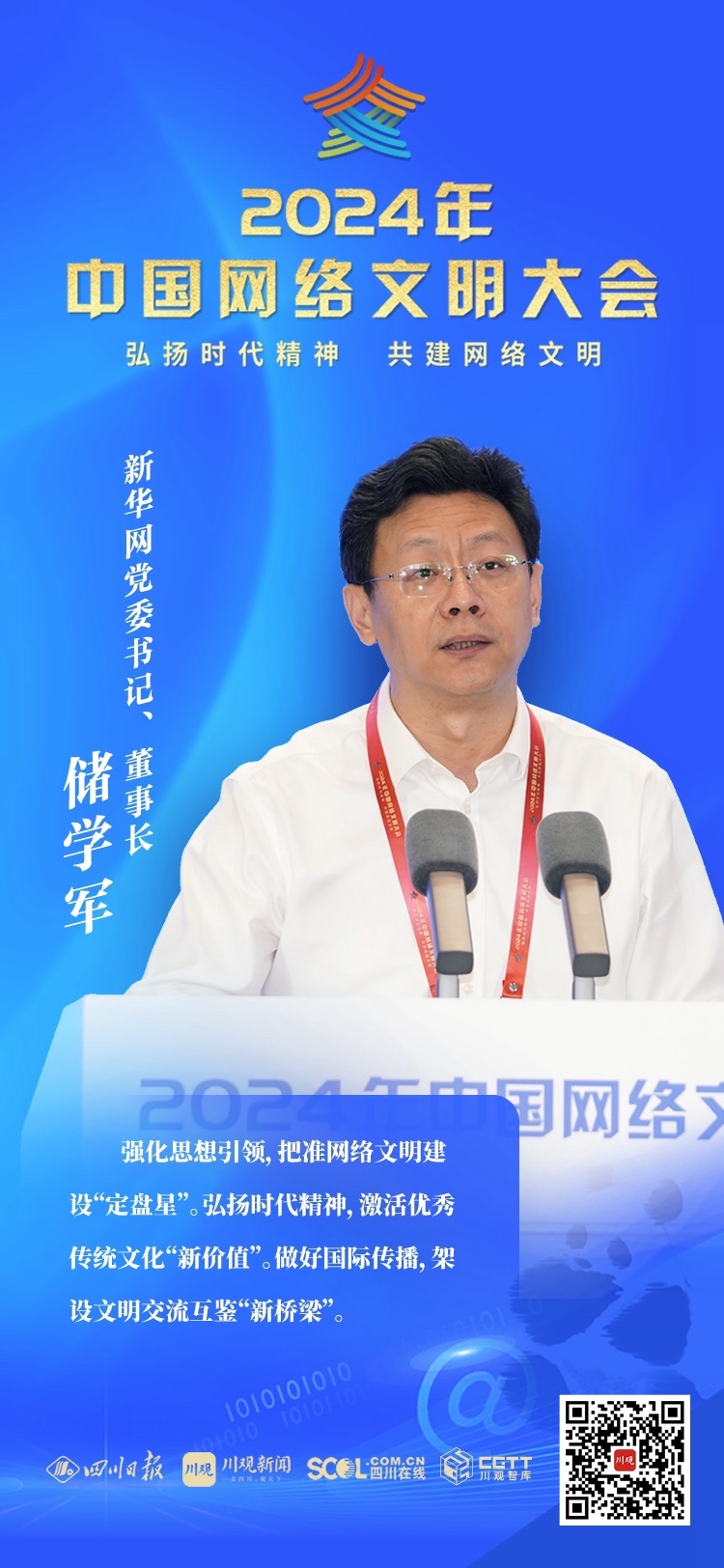 推进网络文明建设是建设中华民族现代文明的一项重要任务,也是实现中国式现代化的必然要求。8月28日举行的2024年中国网络文明大会主论坛上,作为发言嘉宾之一,新华网党委书记、董事长储学军表示,中央重点新闻网站作为党在网上的重要舆论阵地,要重视履行的文化使命,主动扛起网络文化建设的大旗,以主流思想、主流价值引领主流舆论、主流文化,以时代精神激发向上向善、奋进新征程的精神力量。