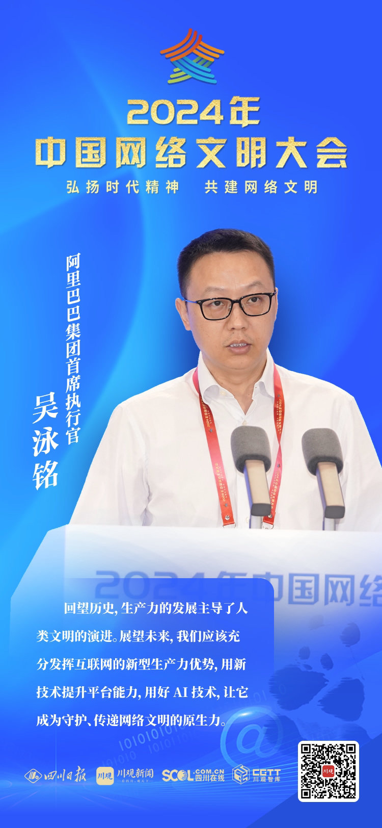 “回望历史,生产力的发展主导了人类文明的演进。展望未来,我们应该充分发挥互联网的新型生产力优势,用新技术提升平台能力,用好AI技术,让它成为守护、传递网络文明的原生力。”吴泳铭说。
