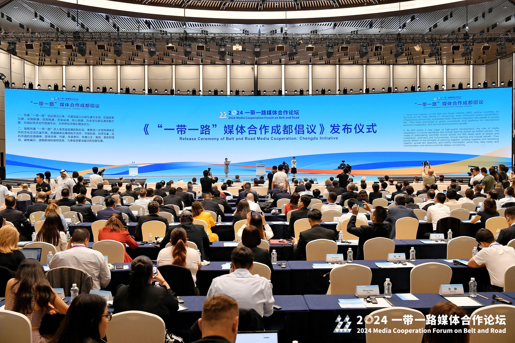 8月28日下午,在2024一带一路媒体合作论坛开幕式上,《“一带一路”媒体合作成都倡议》正式发布。《成都倡议》提出,随着共建“一带一路”进入高质量发展的新阶段,要更进一步发挥媒体合作的文化交流互鉴作用。在共建“一带一路”下一个金色十年,各国媒体将共同传承和发扬丝路精神、厚植丝路情谊,为推动高质量共建“一带一路”,助力世界各国共同实现现代化,建设一个开放包容、互联互通、共同发展的世界,推动构建人类命运共同体,展现媒体担当、贡献媒体力量。