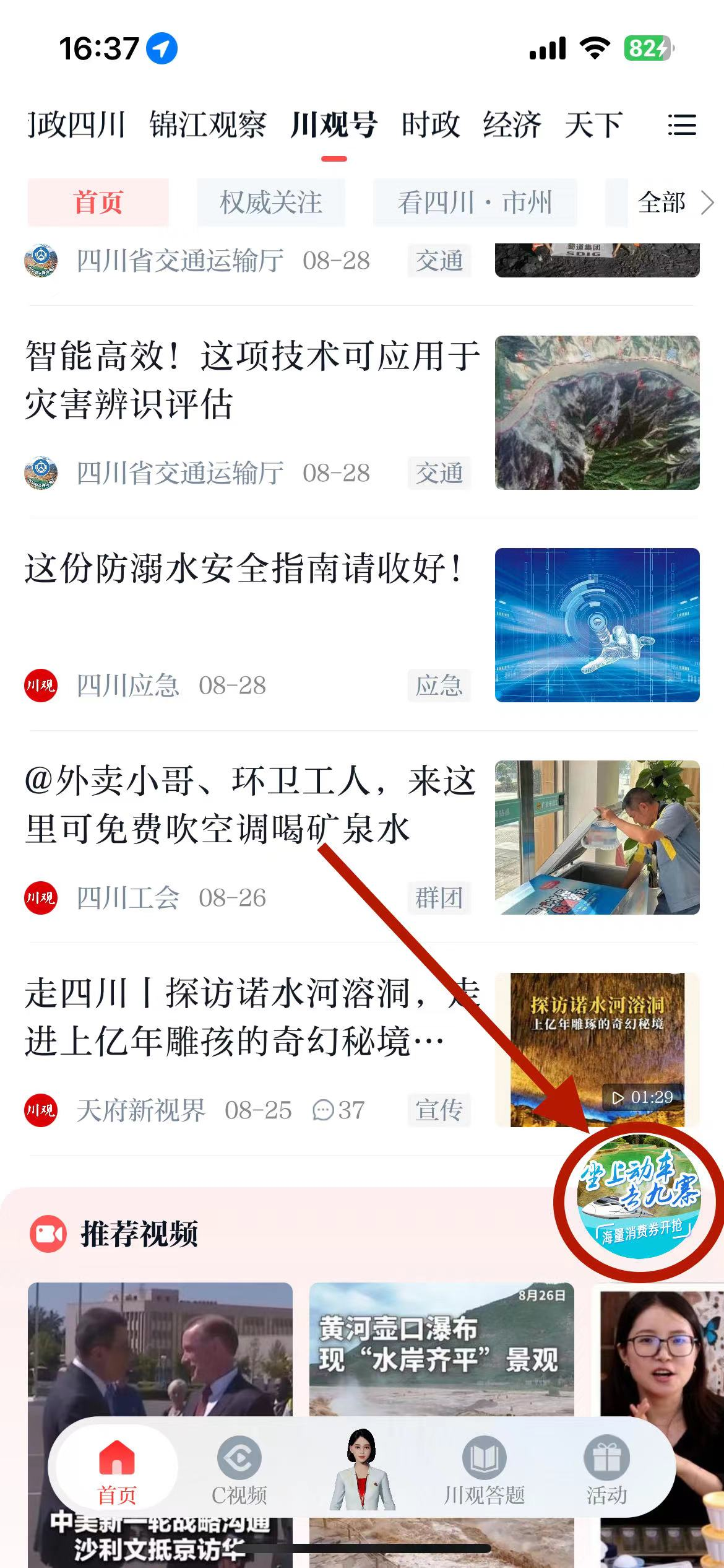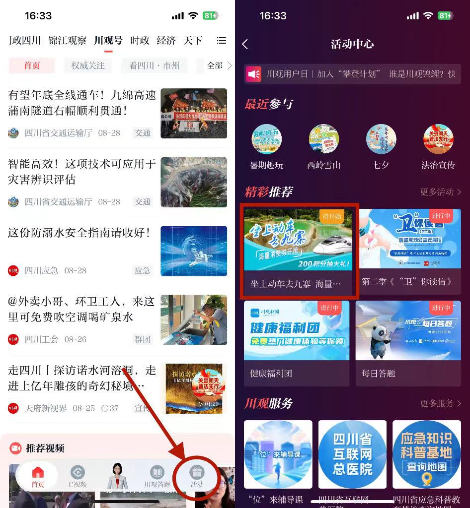 在川观新闻首页,点击右下角“活动”,进入活动中心,找到抢九寨海量消费券活动图片,点击即可参与活动;