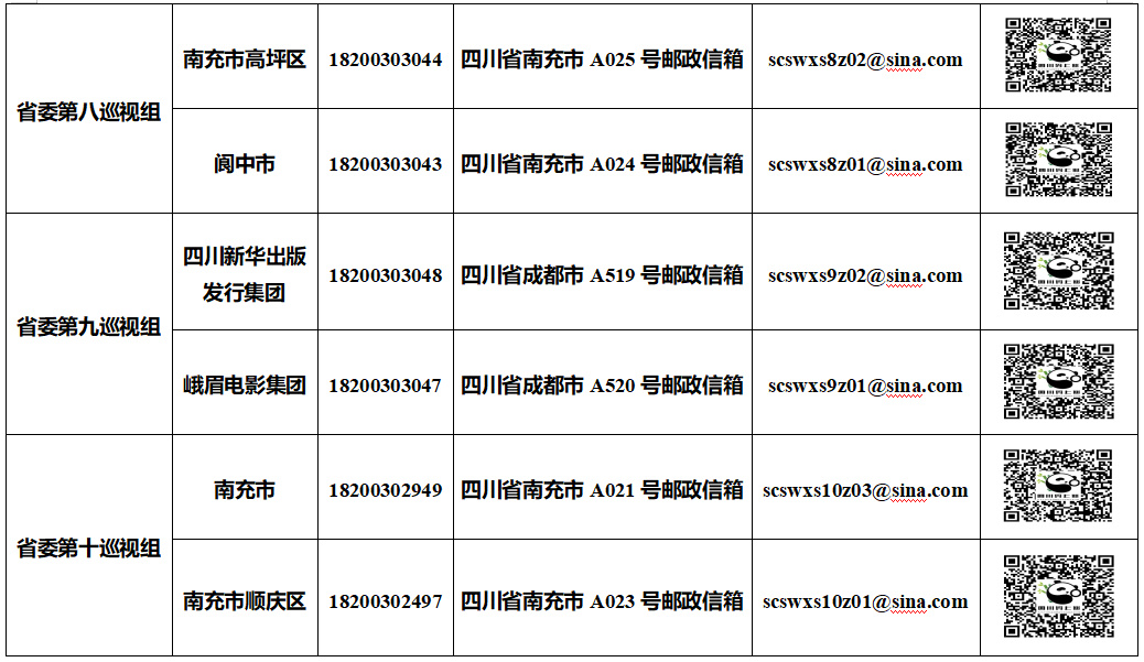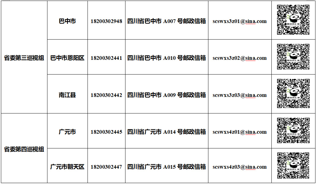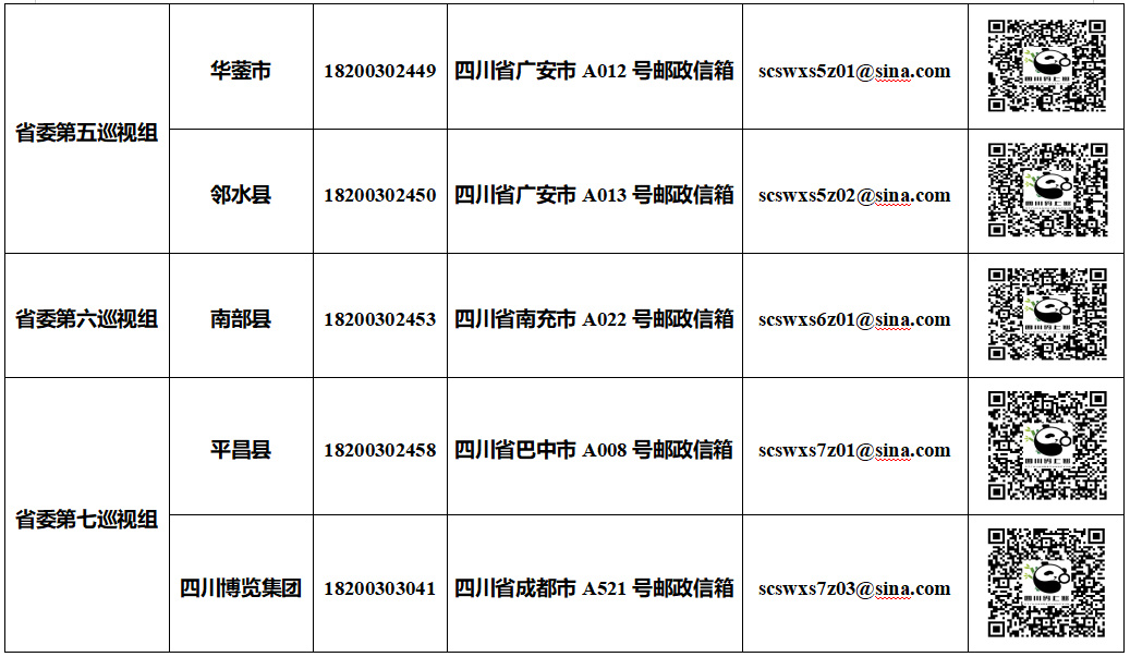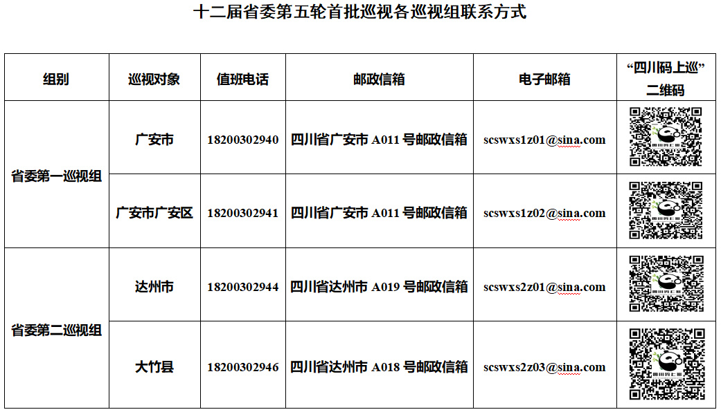 巡视期间,各省委巡视组设置了值班电话、邮政信箱、电子邮箱和“四川码上巡”二维码。巡视组主要受理反映被巡视党组织领导班子及其成员和下一级党组织领导班子主要负责人,以及重点岗位人员问题的来信、来电、来访,重点是关于违反政治纪律、组织纪律、廉洁纪律、群众纪律、工作纪律和生活纪律以及巡视整改等方面的问题反映。对其他不属于巡视受理范围的信访问题,将按规定由被巡视单位和有关部门认真处理。