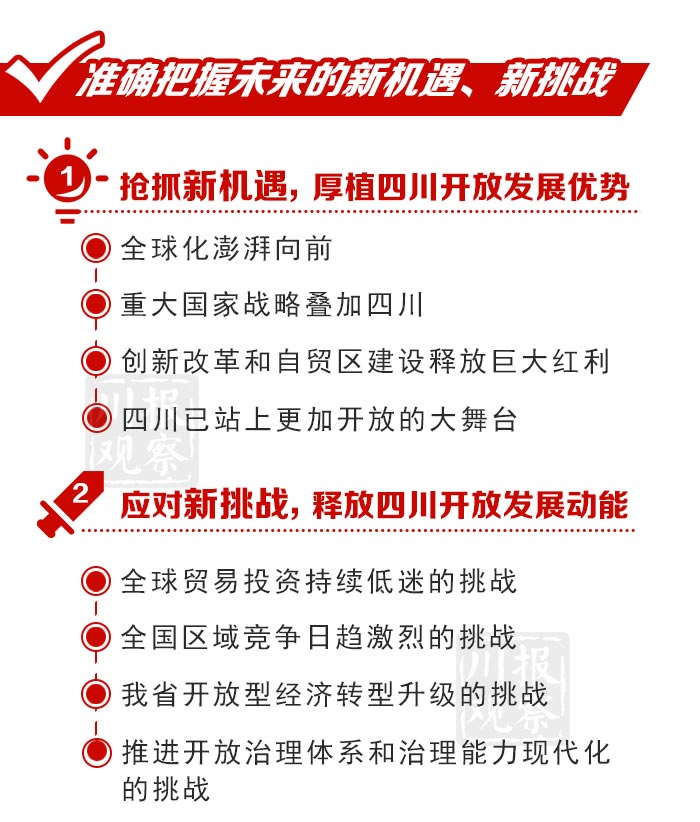 着眼四川未来发展,党代会报告对开放发展进行了总体谋划,提出了“努力在创新驱动转型发展、全面开发开放上走在全国前列”的目标,明确了三个方面的战略重点,着力推动经济综合实力再上新台阶。我们必须敏锐跟进国家战略动向,以抢抓战略机遇对冲不利因素,在国家开放发展大局中主动先行,赢得先机、赢得优势、赢得未来。