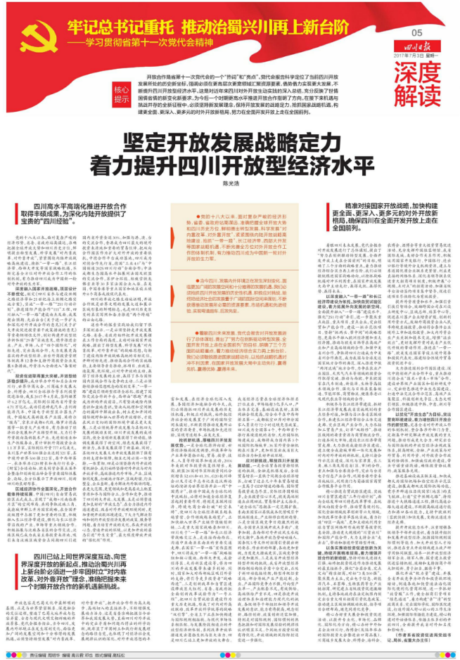 答案可以在今天(7月3日)出版的四川日报第五版上寻找。今天第五版刊发了一篇解读省党代会精神的长文《坚定开放发展战略定力 着力提升四川开放型经济水平》,作者是四川省投资促进局党组书记、局长、省重大办主任陈光浩。文章全面阐释了四川对外开放合作的经验、理念和目标任务,值得收藏细读。