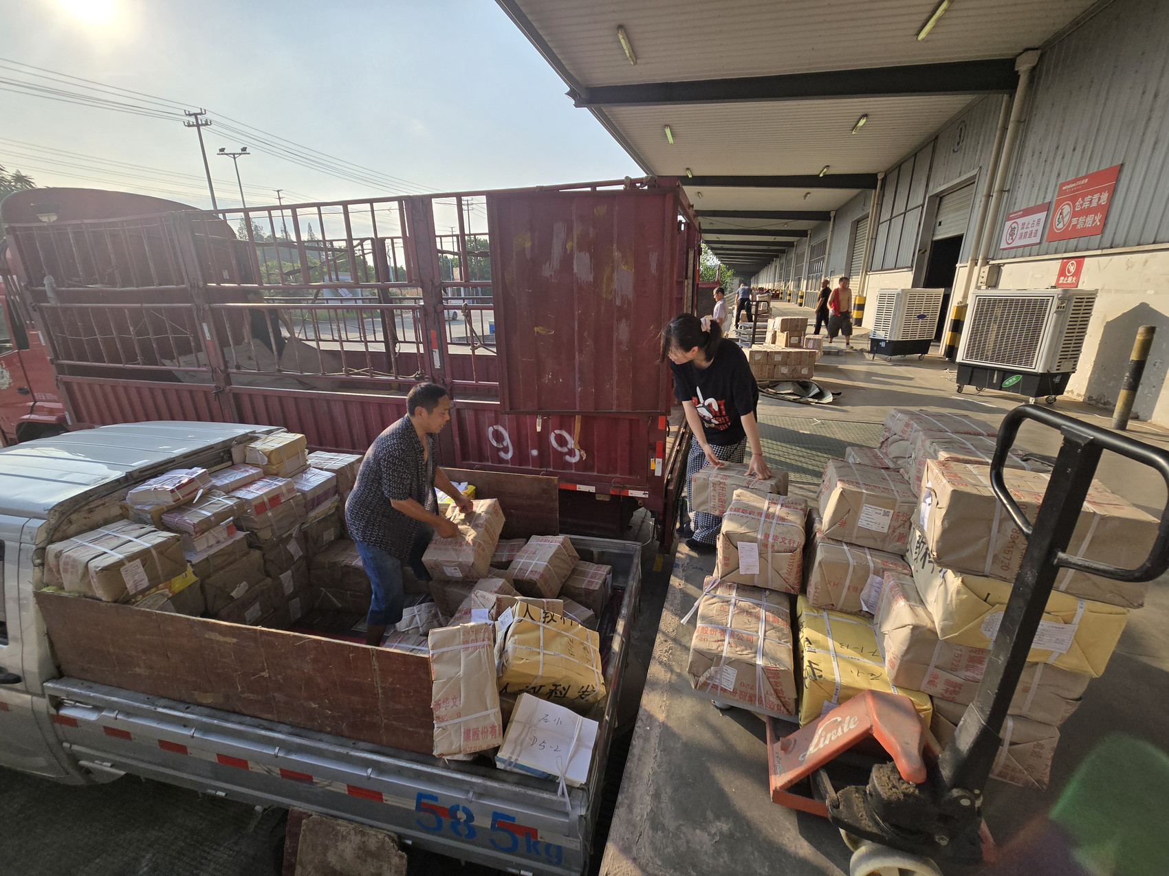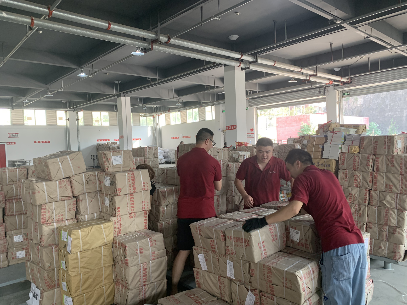 记者在多个现场看到,酷热的仓库里,叉车在密集堆放的“书山”里穿梭,工作人员有的正忙着清点数目、打印清单,按照供货需求拆包、打包……汗水湿透了衣衫。另一边,一辆辆物流车不分昼夜将包件运送到各地区,为加快收发节奏,各地区分公司员工24小时轮班,“白加黑”连轴转,做到来件随到随收货随分拣。巴中、北川、乐至、简阳、绵阳……各分公司的员工要么在清点出库的烈日下,要么在送书的路上。