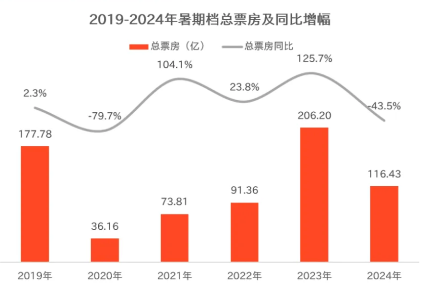 相比2023年创历史纪录的暑期档票房206.2亿元表现,今年的暑期档票房整体近乎腰斩,即使和2019年暑期档票房177.78亿元的表现相比,差距也较大。