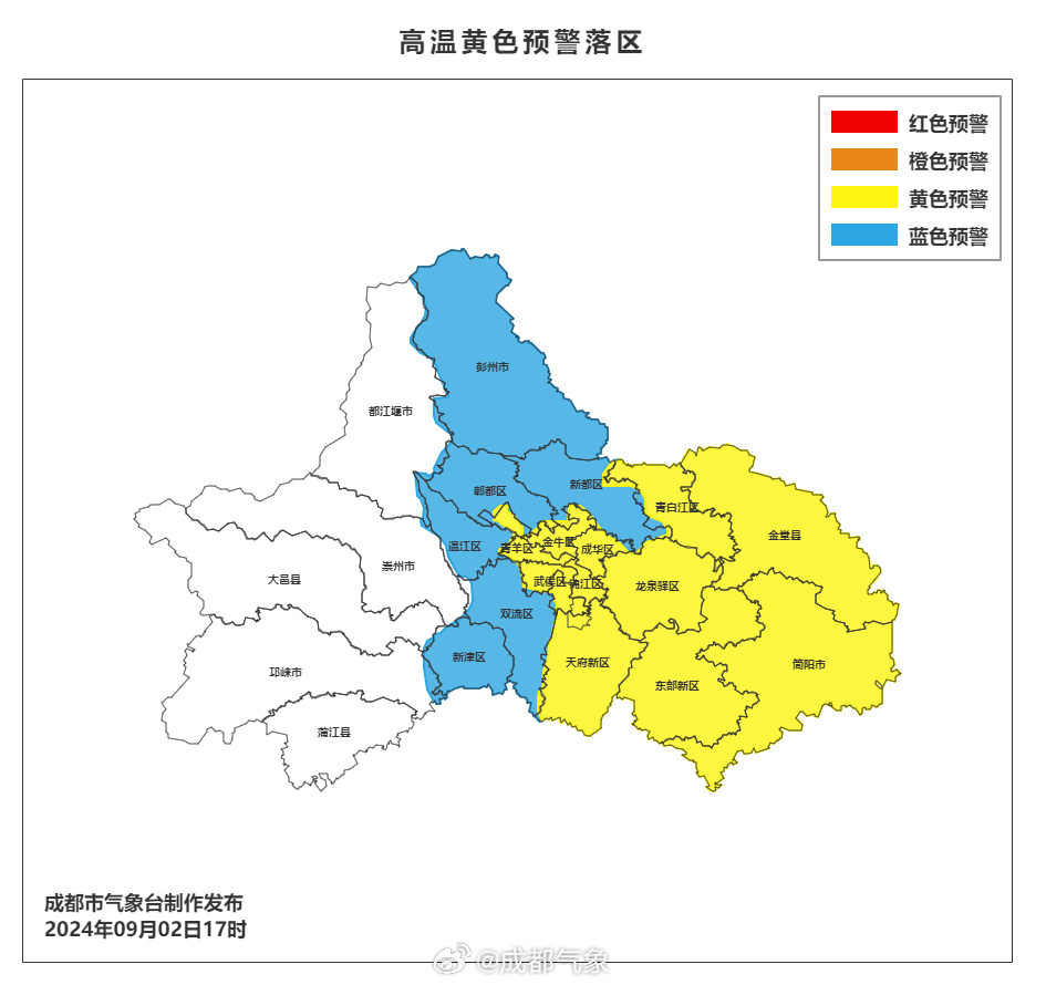 成都市气象台2024年9月2日17时00分更新高温蓝色预警为高温黄色预警: